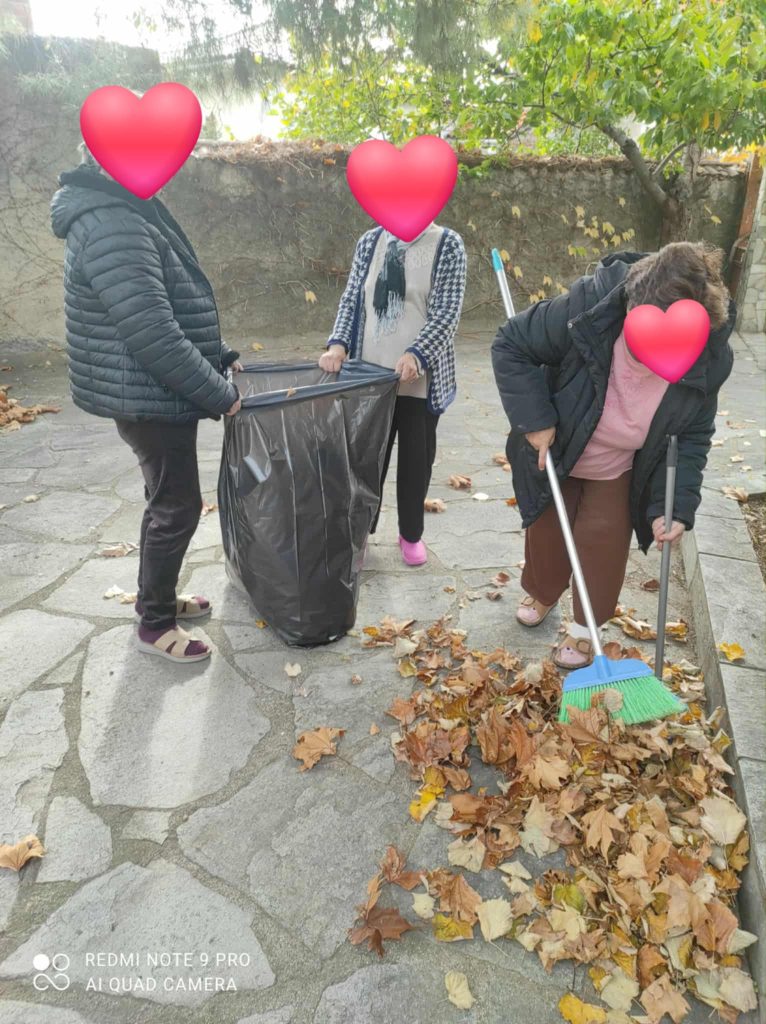 Ομαδική εκπαιδευτική δραστηριότητα: Στα πλαίσια της ημιαυτόνομης διαβίωσης και της ενίσχυσης των ατομικών και κοινωνικών δεξιοτήτων των ανθρώπων μας, πραγματοποιήσαμε μια οργανωμένη δραστηριότητα καθαριότητας της αυλής μας. Συγκεκριμένα οι φιλοξενούμενοι μας συμμετείχαν ενεργά στον καθαρισμό του υπαίθριου χώρου από τα πεσμένα φύλλα , προάγοντας την αυτονομία, την υπευθυνότητα και τη συνεργατικότητα μέσα από πρακτικές δράσεις της καθημερινότητας.